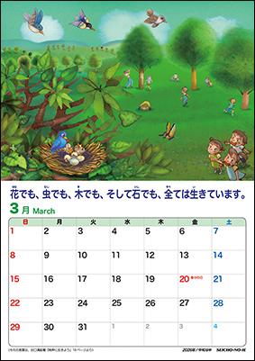 1月から12月の各月のカレンダーには、元気に遊び、学ぶこどもたちのイラストと、生長の家の聖典・書籍から選ばれた言葉が掲載されています。
